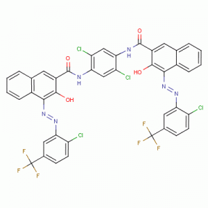 Engelska alias: Pigment rött 242; PR242; Sandorin Scarlet 4RF; 2-naftalenkarboxamid, N, N '- (2,5-diklor-1,4-fenylen) bis- [4 - [[2-kloro-5- (trifluormetyl) fenyl] azo] -3-hydroxi-3-hydroxi -; (4Z, 4'E) -N, N '- (2,5-diklorbensen-1,4-diyl) bis (4 - {[2- kloro-5- (trifluormetyl) fenyl] hydrazono} -3-oxo- 3,4-dihydronaftalen-2-karboxamid); 4- [2-kloro-5- (trifluormetyl) fenyl] azo-N- [2,5-diklor-4 - [[4- [2-kloro-5- (trifluormetyl) fenyl] azo-3-hydroxi-naftalen -2-karbonyl] amino] fenyl] -3-hydroxi-naftalen-2-karboxamid; N, N '- (2,5-diklor-1,4-fenylen) bis [4 - [[2-kloro-5- (trifluormetyl) fenyl] azo] -3-hydroxynaftalen-2-karboxamid] CAS-nummer: 52238 -92-3